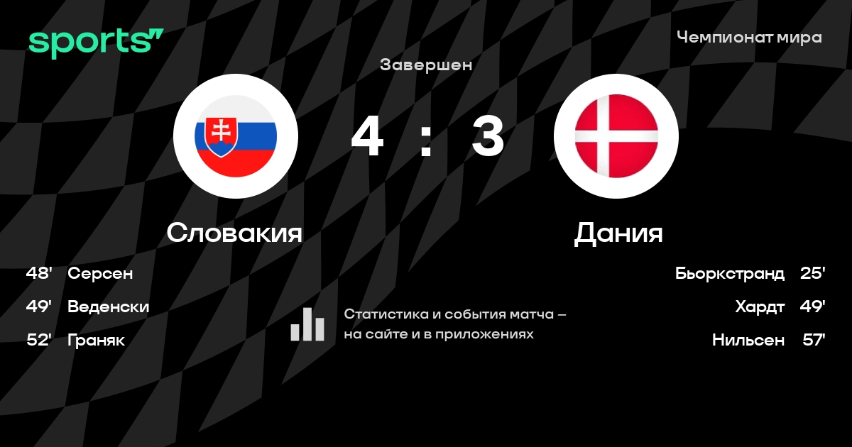 В прошедшем матче в рамках турнира Чемпионат мира (Группа B) состоялась встреча команд Словакия - Дания в городе Острава (Чехия) на стадионе ČEZ Арена (вместимость - 9821)