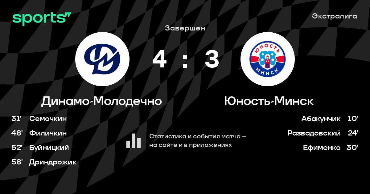 В прошедшем матче в рамках турнира Экстралига состоялась встреча команд Динамо-Молодечно - Юность-Минск в городе Молодечно (Беларусь) на стадионе Ледовый дворец Молодечно (вместимость - 2000)