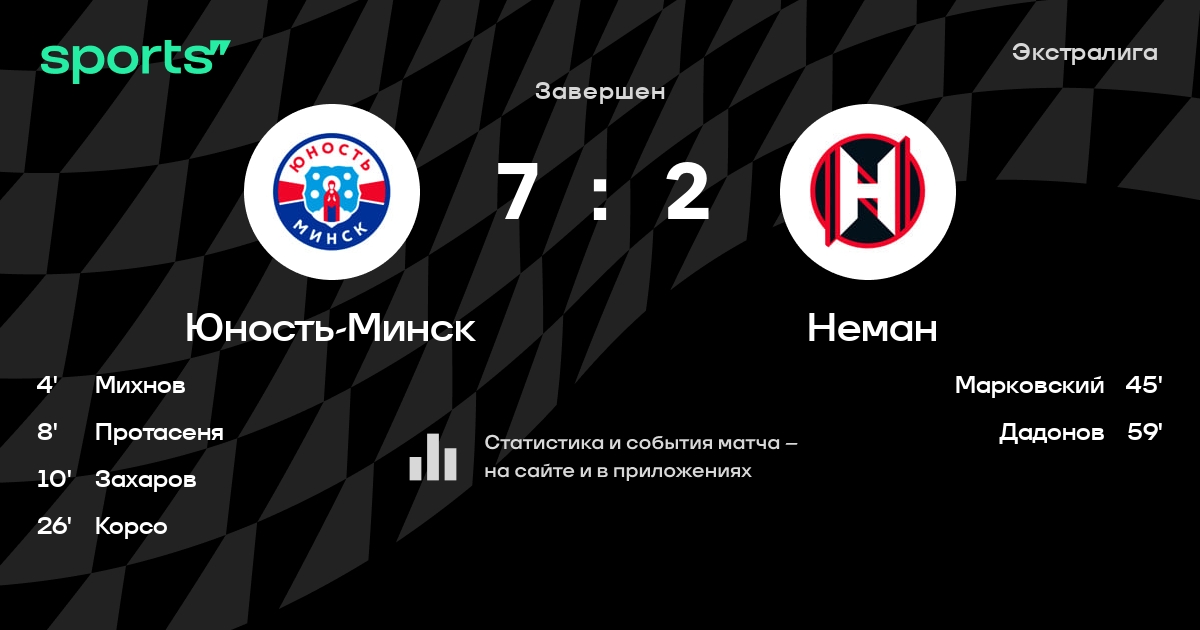 В прошедшем матче в рамках турнира Экстралига состоялась встреча команд Юность-Минск - Неман в городе Minsk на стадионе Yunost Minsk Arena