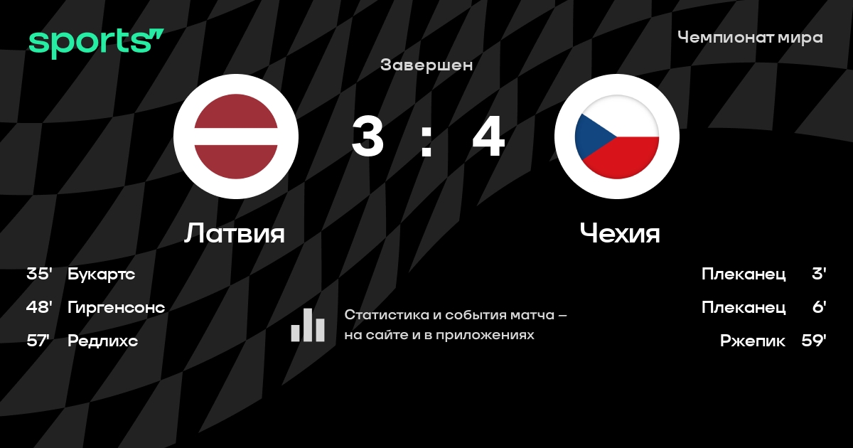 В прошедшем матче в рамках турнира Чемпионат мира (Группа A) состоялась встреча команд Латвия - Чехия в городе Москва (Россия) на стадионе ЦСКА-Арена (вместимость - 5600)