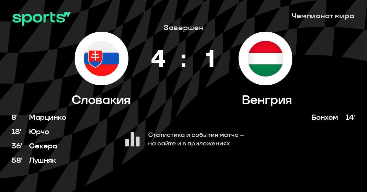 В прошедшем матче в рамках турнира Чемпионат мира (Группа B) состоялась встреча команд Словакия - Венгрия в городе Санкт-Петербург (Россия) на стадионе Юбилейный (вместимость - 13100)