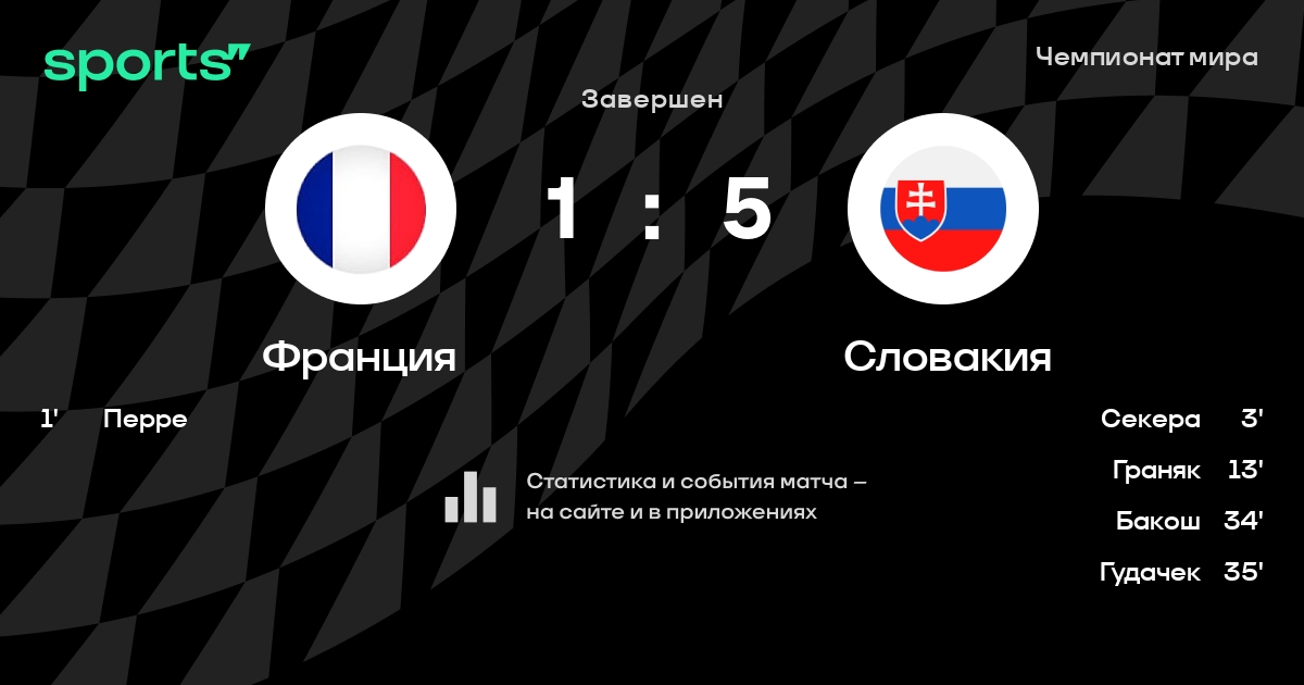 В прошедшем матче в рамках турнира Чемпионат мира (Группа B) состоялась встреча команд Франция - Словакия в городе Санкт-Петербург (Россия) на стадионе Юбилейный (вместимость - 13100)