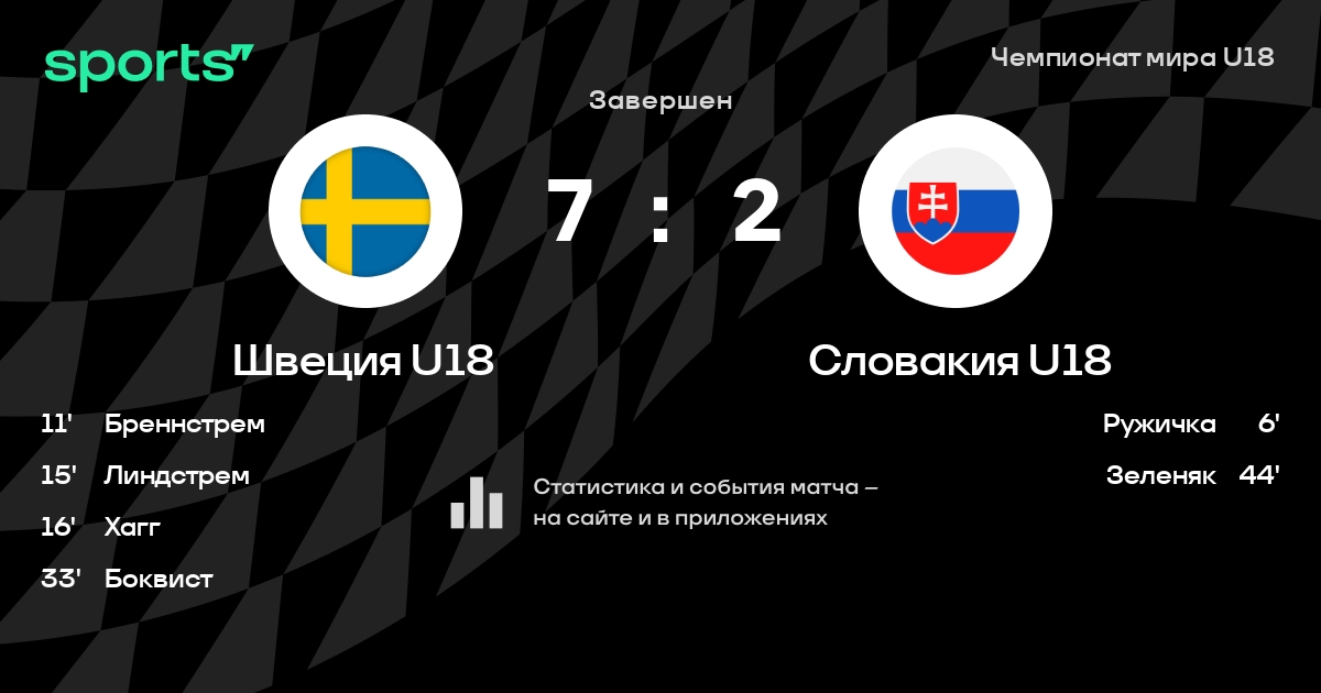 В прошедшем матче в рамках турнира Чемпионат мира U18 (Четвертьфинал) состоялась встреча команд Швеция U18 - Словакия U18