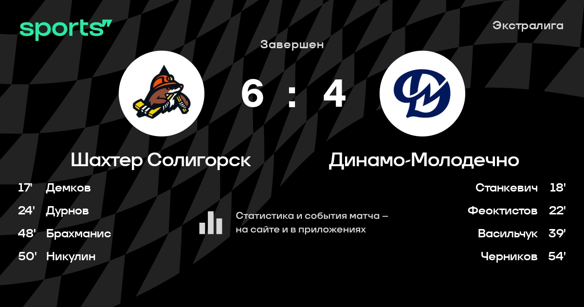 В прошедшем матче в рамках турнира Экстралига состоялась встреча команд Шахтер Солигорск - Динамо-Молодечно в городе Солигорск (Беларусь) на стадионе Ледовый дворец спорта Солигорск (вместимость - 1800)