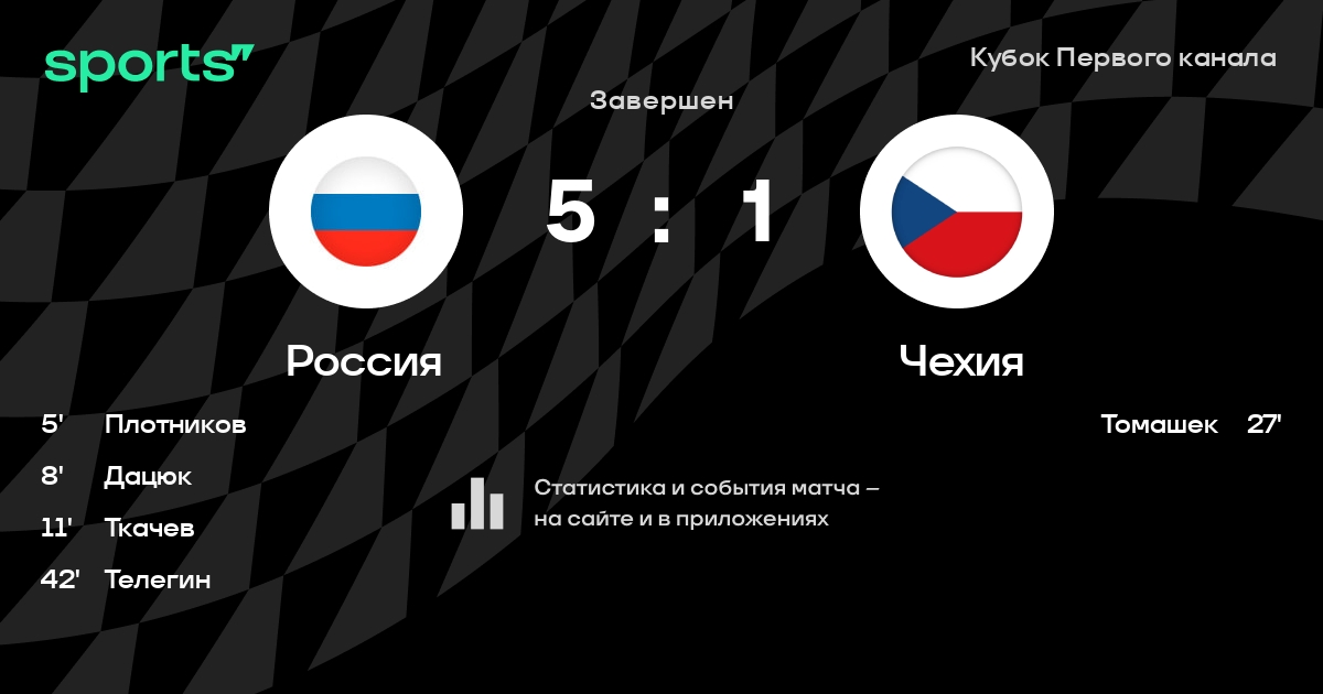 В прошедшем матче в рамках турнира Кубок Первого канала состоялась встреча команд Россия - Чехия в городе Москва (Россия) на стадионе ЦСКА-Арена (вместимость - 5600)