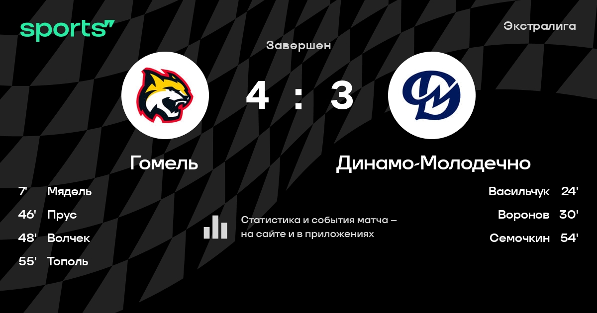 В прошедшем матче в рамках турнира Экстралига состоялась встреча команд Гомель - Динамо-Молодечно в городе Гомель (Беларусь) на стадионе Ледовый дворец Гомель (вместимость - 2700)