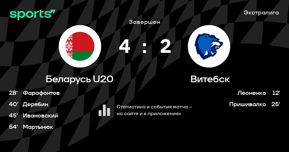 В прошедшем матче в рамках турнира Экстралига состоялась встреча команд Беларусь U20 - Витебск в городе Минск (Беларусь) на стадионе Чижовка-Арена (вместимость - 9487)