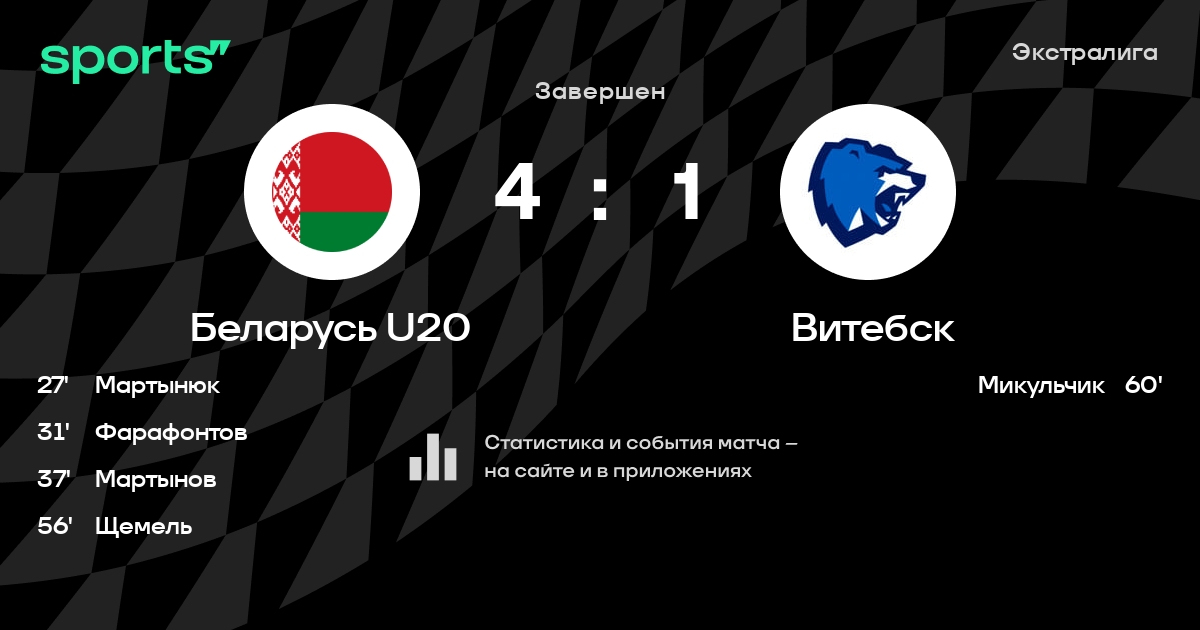 В прошедшем матче в рамках турнира Экстралига состоялась встреча команд Беларусь U20 - Витебск в городе Минск (Беларусь) на стадионе Чижовка-Арена (вместимость - 9487)