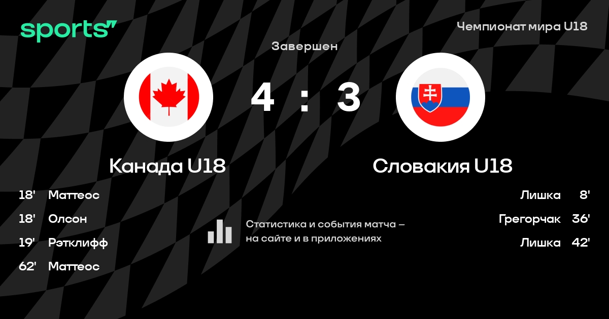 В прошедшем матче в рамках турнира Чемпионат мира U18 (Группа A) состоялась встреча команд Канада U18 - Словакия U18 в городе Poprad на стадионе Poprad Ice Stadium