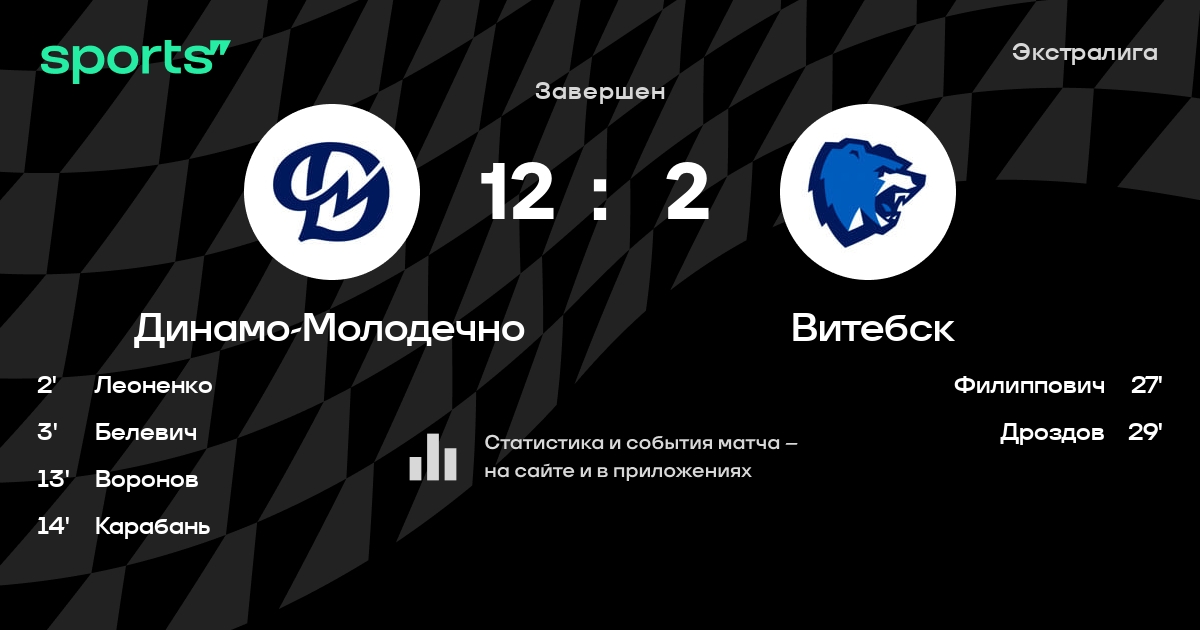 В прошедшем матче в рамках турнира Экстралига состоялась встреча команд Динамо-Молодечно - Витебск в городе Молодечно (Беларусь) на стадионе Ледовый дворец Молодечно (вместимость - 2000)