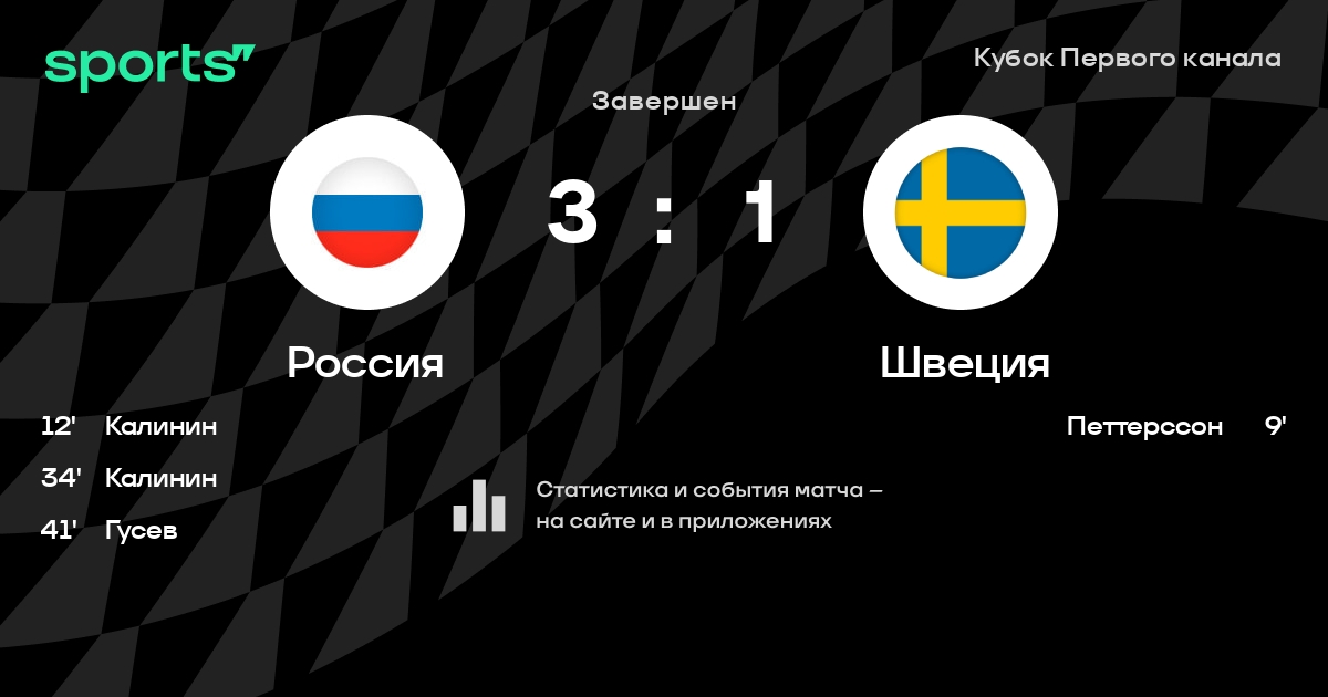 В прошедшем матче в рамках турнира Кубок Первого канала состоялась встреча команд Россия - Швеция в городе Москва (Россия) на стадионе ЦСКА-Арена (вместимость - 5600)