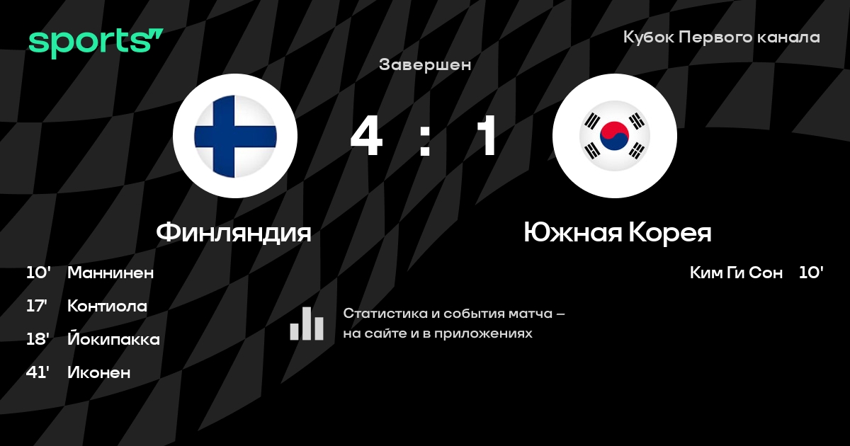 В прошедшем матче в рамках турнира Кубок Первого канала состоялась встреча команд Финляндия - Южная Корея в городе Москва (Россия) на стадионе ЦСКА-Арена (вместимость - 5600)