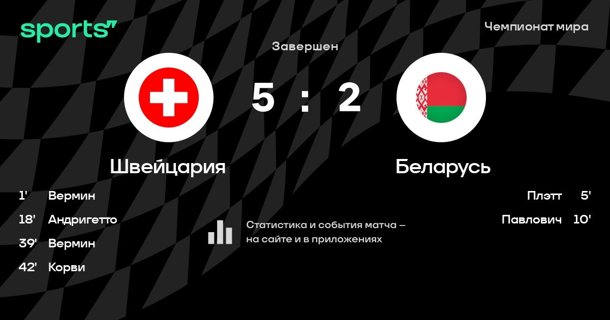 В прошедшем матче в рамках турнира Чемпионат мира (Группа A) состоялась встреча команд Швейцария - Беларусь в городе Copenhagen (Дания) на стадионе Royal Arena (вместимость - 12500)