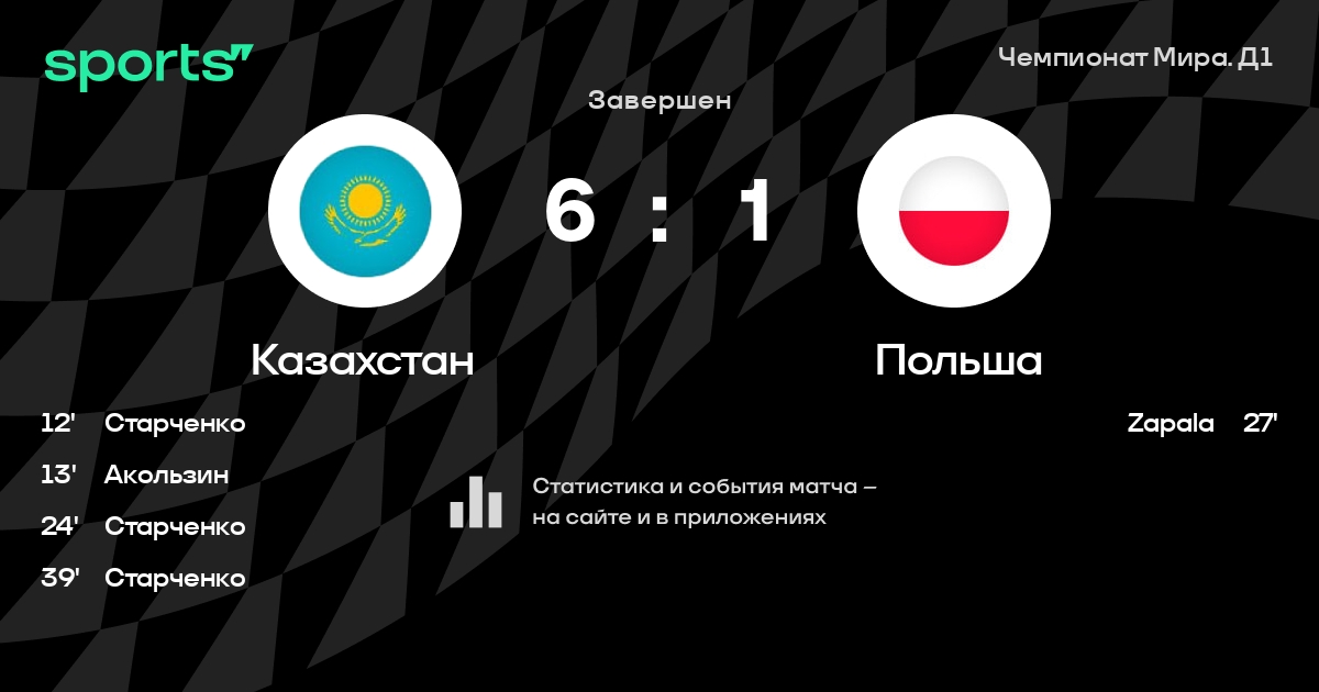 В прошедшем матче в рамках турнира Чемпионат Мира. Д1 (Группа A) состоялась встреча команд Казахстан - Польша в городе Budapest на стадионе Papp L?szl? Sportar?na