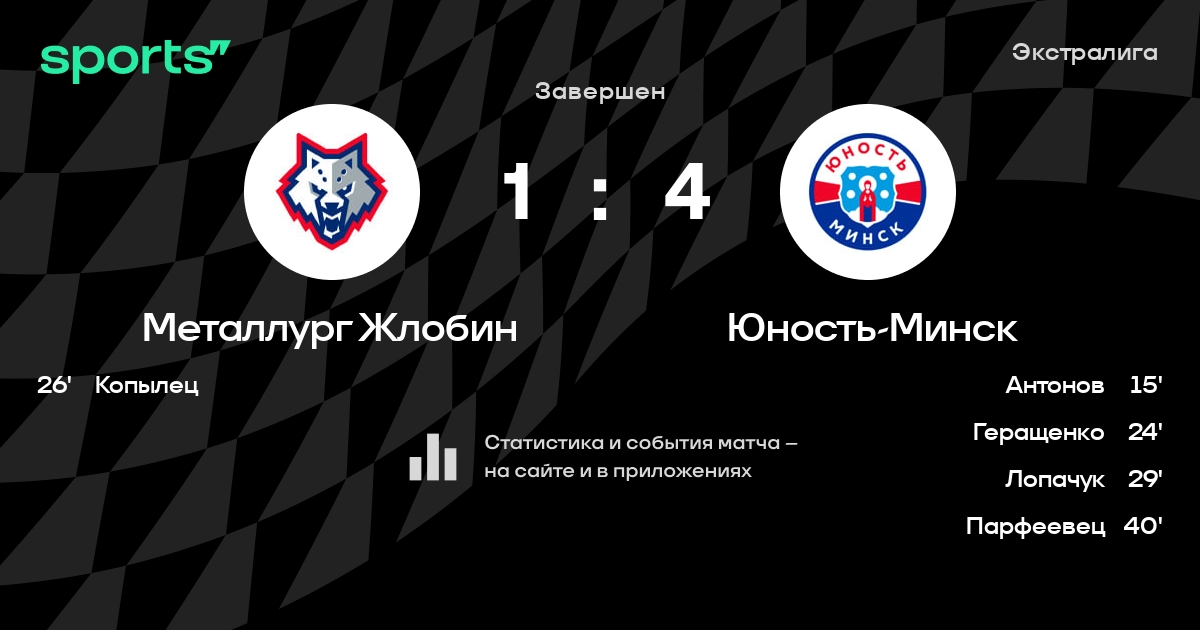 В прошедшем матче в рамках турнира Экстралига состоялась встреча команд Металлург Жлобин - Юность-Минск в городе Жлобин (Беларусь) на стадионе Ледовый дворец Металлург (вместимость - 2018)