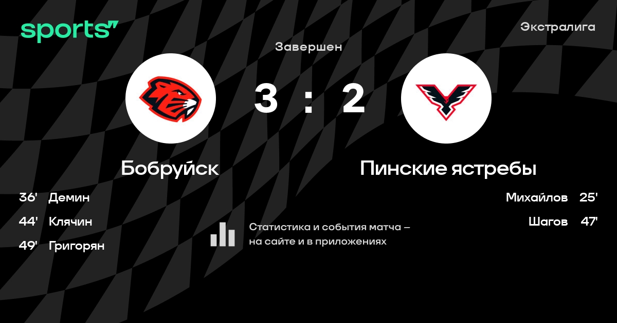 В прошедшем матче в рамках турнира Экстралига состоялась встреча команд Бобруйск - Пинские ястребы в городе Бобруйск (Беларусь) на стадионе Бобруйск-Арена (вместимость - 7191)