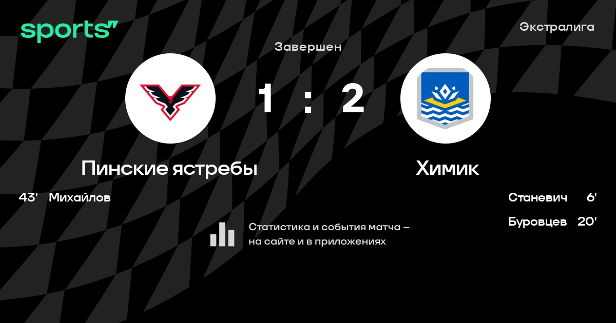 В прошедшем матче в рамках турнира Экстралига состоялась встреча команд Пинские ястребы - Химик в городе Пинск (Беларусь) на стадионе Ледовый дворец спорта Пинск (вместимость - 598)