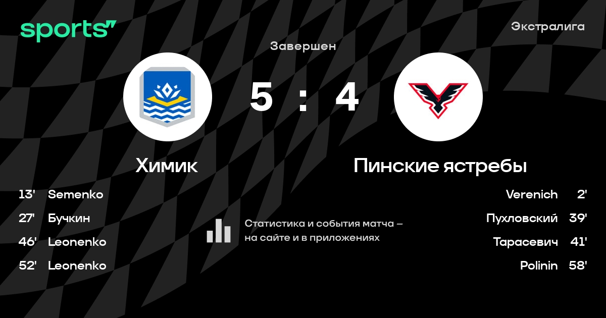 В прошедшем матче в рамках турнира Экстралига состоялась встреча команд Химик - Пинские ястребы в городе Новополоцк (Беларусь) на стадионе Дворец культуры и спорта (вместимость - 1200)