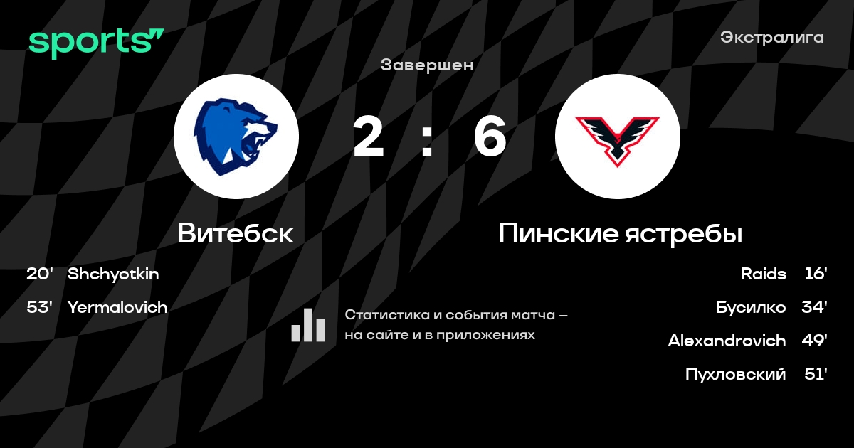 В прошедшем матче в рамках турнира Экстралига состоялась встреча команд Витебск - Пинские ястребы в городе Витебск (Беларусь) на стадионе Витебский дворец спорта (вместимость - 2000)
