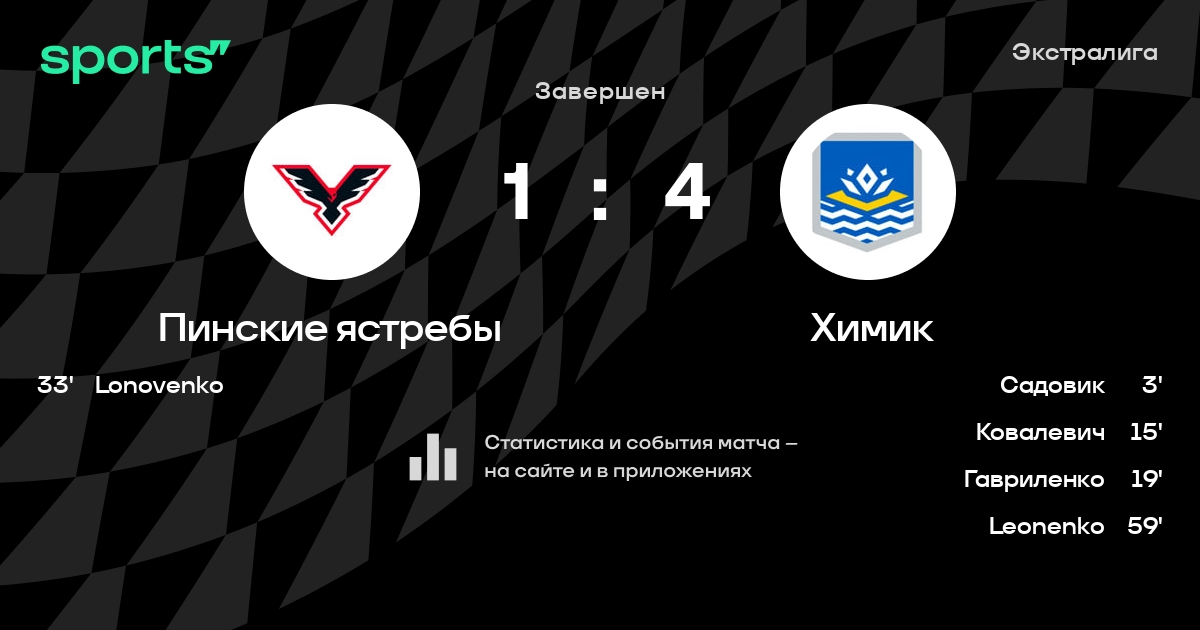 В прошедшем матче в рамках турнира Экстралига состоялась встреча команд Пинские ястребы - Химик в городе Пинск (Беларусь) на стадионе Ледовый дворец спорта Пинск (вместимость - 598)