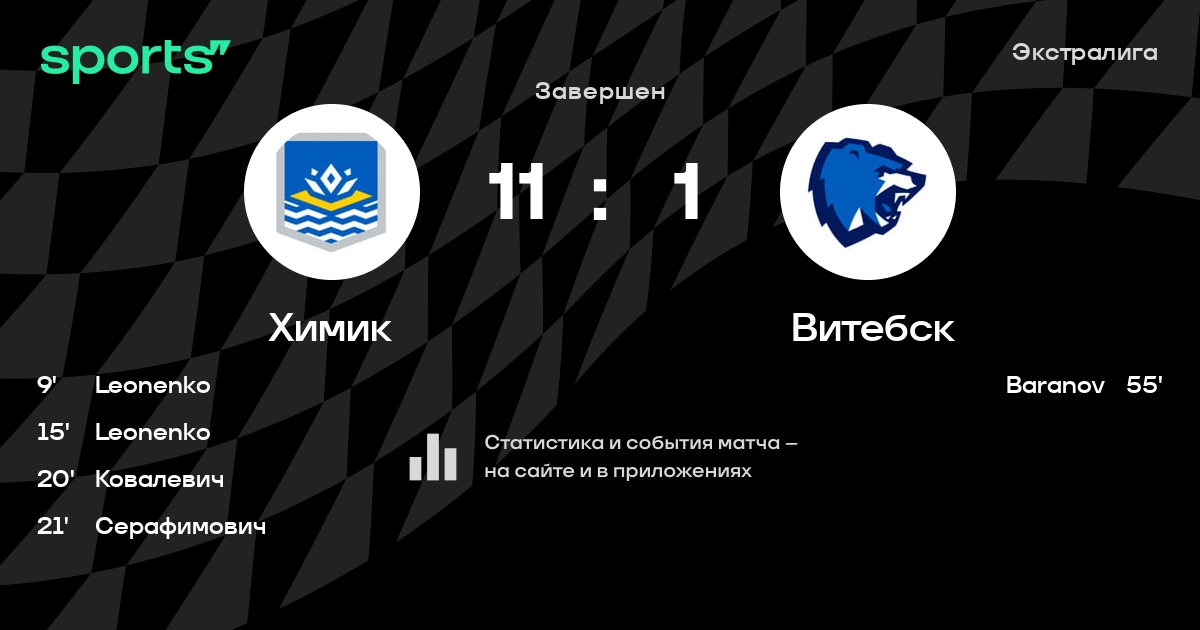 В прошедшем матче в рамках турнира Экстралига состоялась встреча команд Химик - Витебск в городе Новополоцк (Беларусь) на стадионе Дворец культуры и спорта (вместимость - 1200)