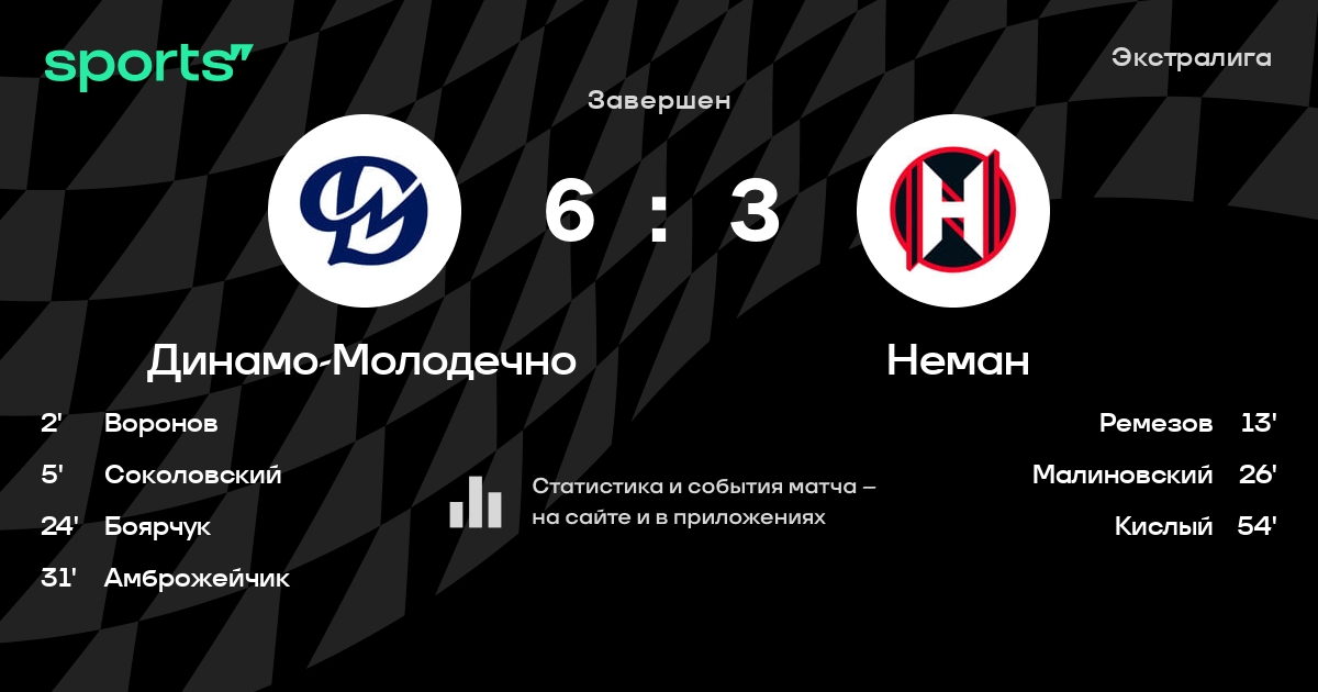 В прошедшем матче в рамках турнира Экстралига состоялась встреча команд Динамо-Молодечно - Неман в городе Молодечно (Беларусь) на стадионе Ледовый дворец Молодечно (вместимость - 2000)