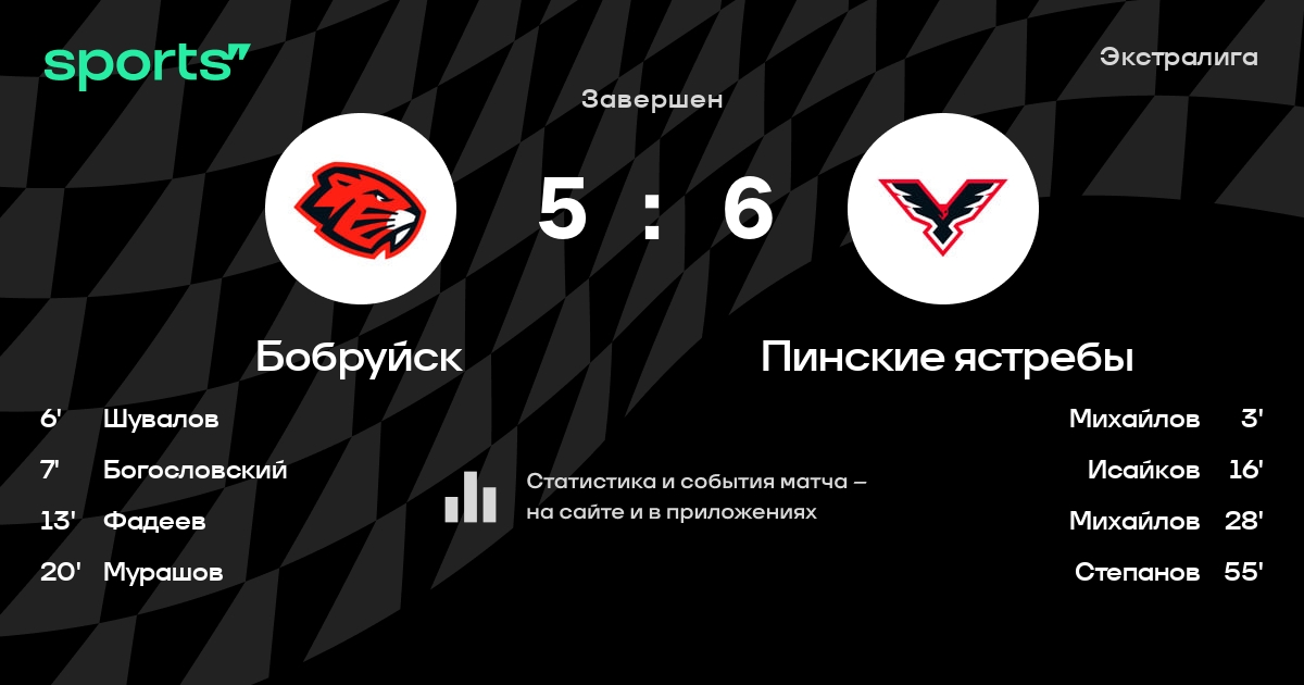 В прошедшем матче в рамках турнира Экстралига состоялась встреча команд Бобруйск - Пинские ястребы в городе Бобруйск (Беларусь) на стадионе Бобруйск-Арена (вместимость - 7191)
