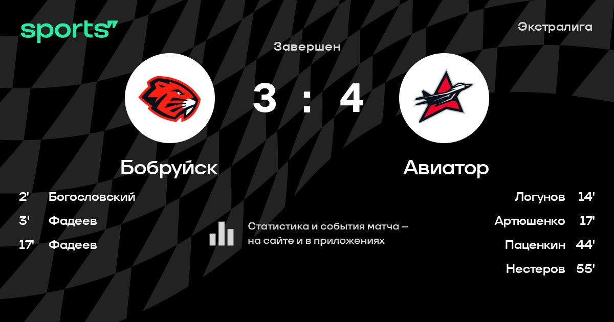 В прошедшем матче в рамках турнира Экстралига состоялась встреча команд Бобруйск - Авиатор в городе Бобруйск (Беларусь) на стадионе Бобруйск-Арена (вместимость - 7191)