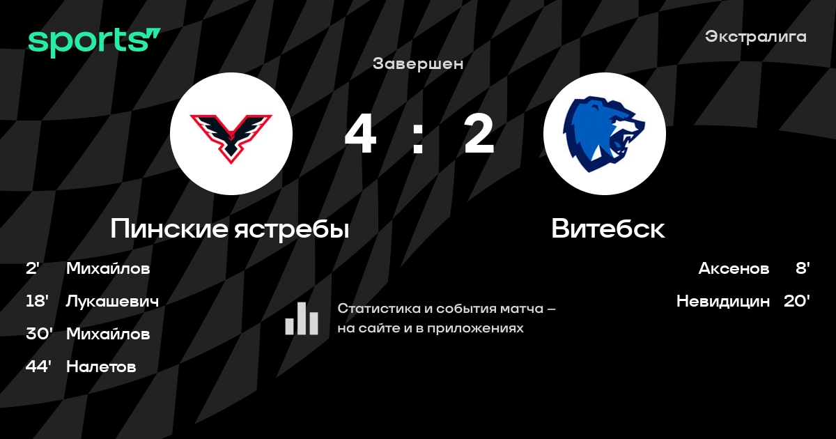 В прошедшем матче в рамках турнира Экстралига состоялась встреча команд Пинские ястребы - Витебск в городе Пинск (Беларусь) на стадионе Ледовый дворец спорта Пинск (вместимость - 598)