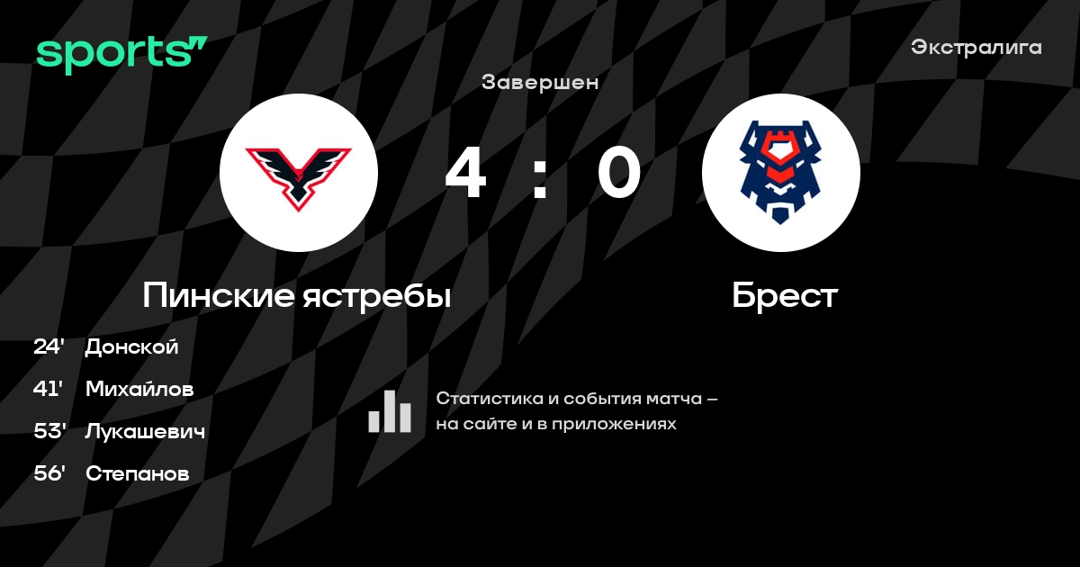 В прошедшем матче в рамках турнира Экстралига состоялась встреча команд Пинские ястребы - Брест в городе Пинск (Беларусь) на стадионе Ледовый дворец спорта Пинск (вместимость - 598)