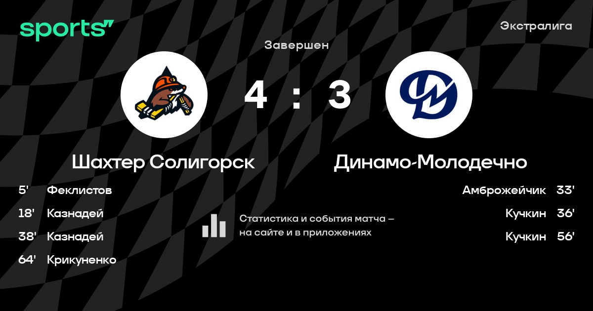 В прошедшем матче в рамках турнира Экстралига состоялась встреча команд Шахтер Солигорск - Динамо-Молодечно в городе Солигорск (Беларусь) на стадионе Ледовый дворец спорта Солигорск (вместимость - 1800)