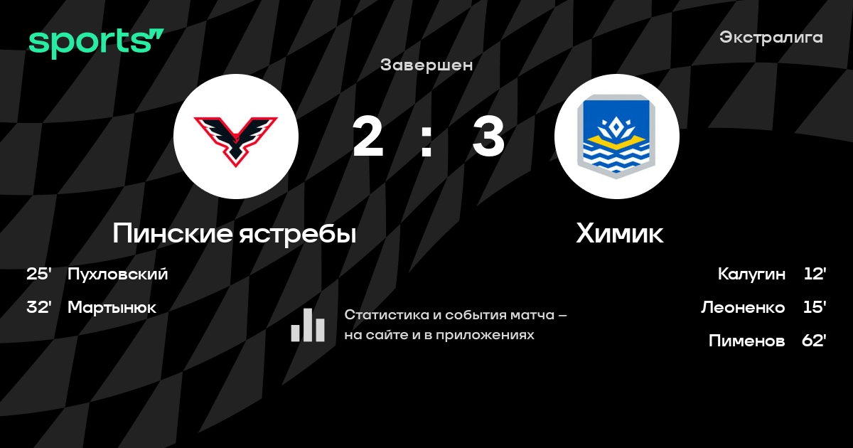 В прошедшем матче в рамках турнира Экстралига состоялась встреча команд Пинские ястребы - Химик в городе Пинск (Беларусь) на стадионе Ледовый дворец спорта Пинск (вместимость - 598)