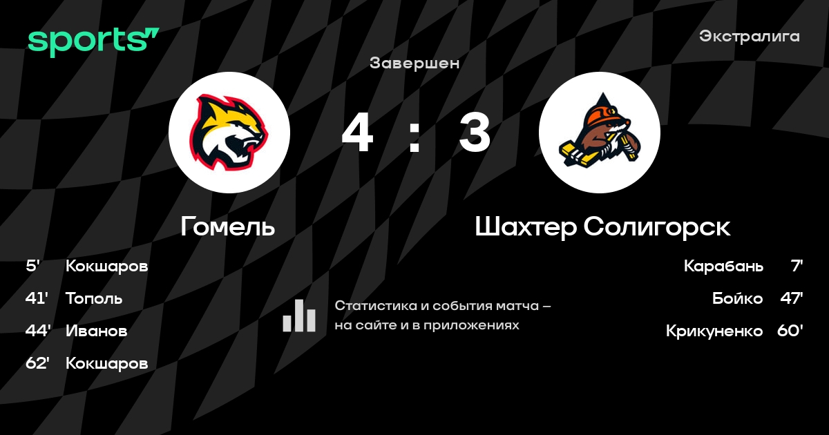 В прошедшем матче в рамках турнира Экстралига состоялась встреча команд Гомель - Шахтер Солигорск в городе Гомель (Беларусь) на стадионе Ледовый дворец Гомель (вместимость - 2700)