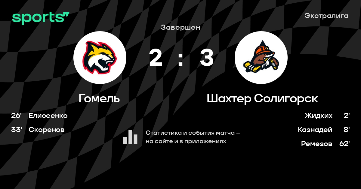 В прошедшем матче в рамках турнира Экстралига состоялась встреча команд Гомель - Шахтер Солигорск в городе Гомель (Беларусь) на стадионе Ледовый дворец Гомель (вместимость - 2700)