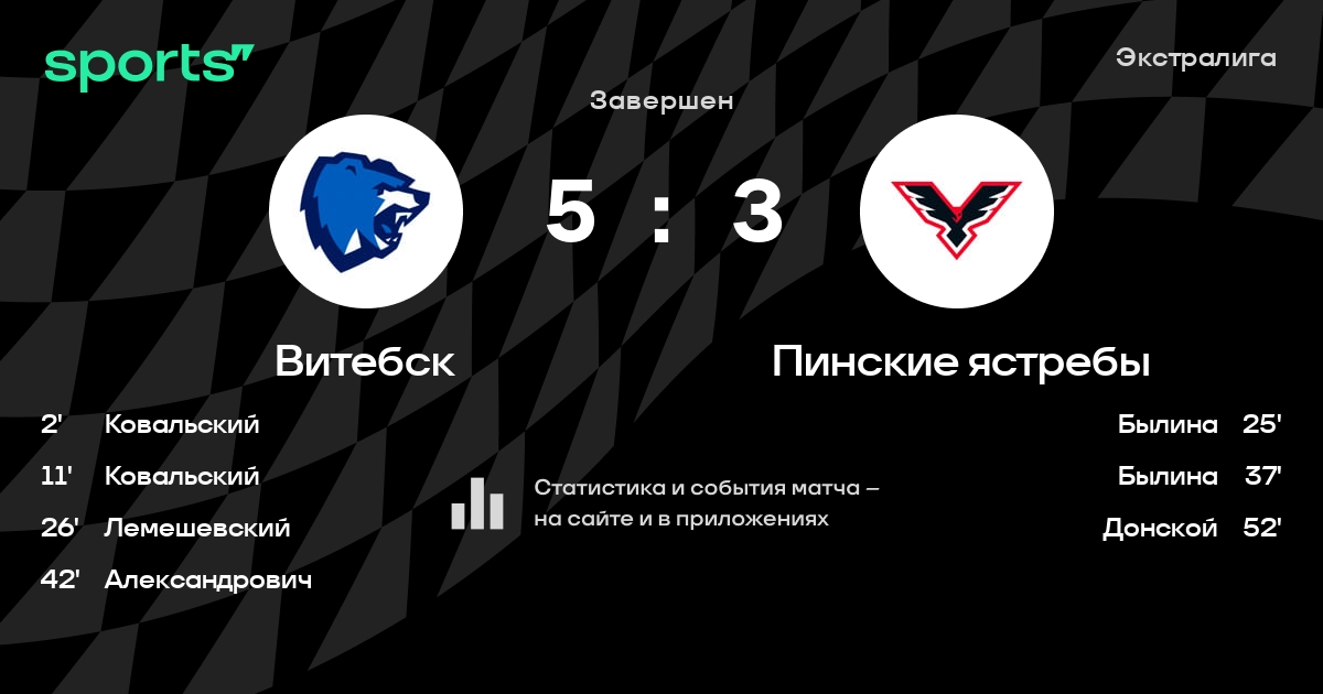 В прошедшем матче в рамках турнира Экстралига состоялась встреча команд Витебск - Пинские ястребы в городе Витебск (Беларусь) на стадионе Витебский дворец спорта (вместимость - 2000)