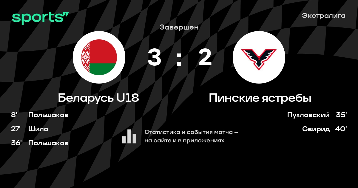 В прошедшем матче в рамках турнира Экстралига состоялась встреча команд Беларусь U18 - Пинские ястребы в городе Острошицкий Городок (Беларусь) на стадионе Ледовая арена Раубичи (вместимость - 120)