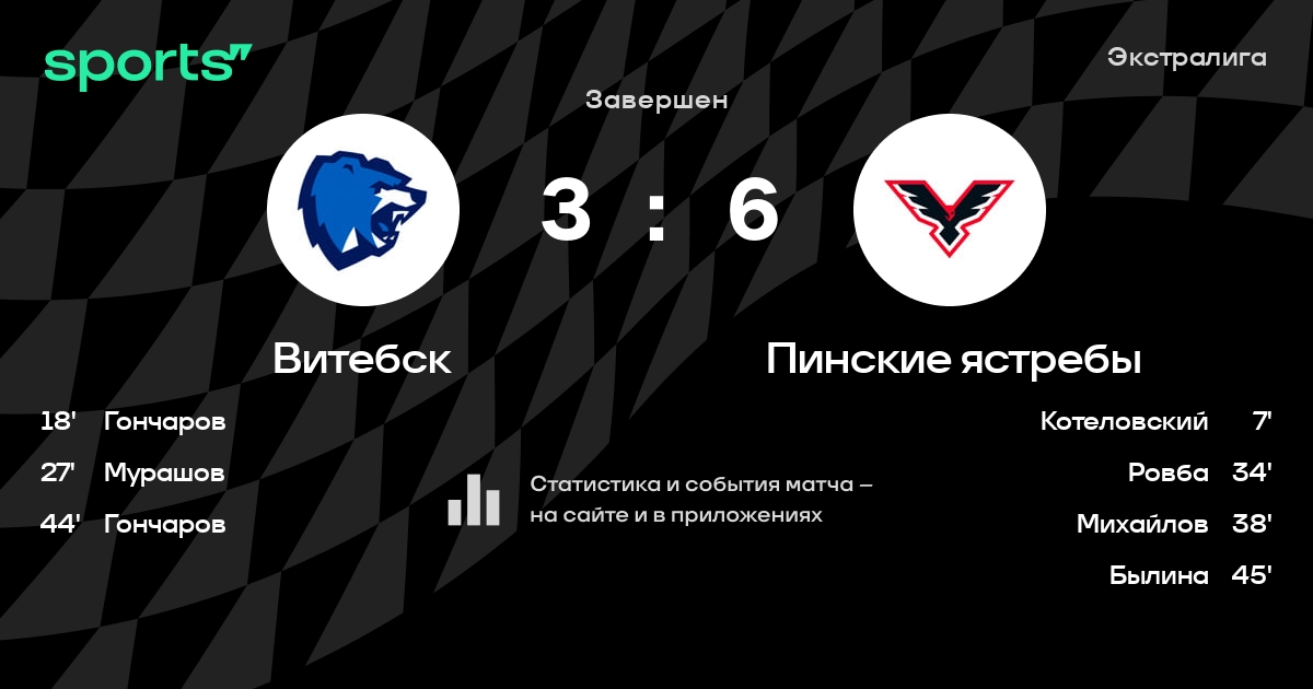 В прошедшем матче в рамках турнира Экстралига состоялась встреча команд Витебск - Пинские ястребы в городе Витебск (Беларусь) на стадионе Витебский дворец спорта (вместимость - 2000)