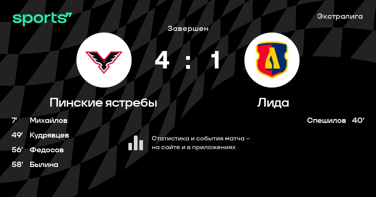 В прошедшем матче в рамках турнира Экстралига состоялась встреча команд Пинские ястребы - Лида в городе Пинск (Беларусь) на стадионе Ледовый дворец спорта Пинск (вместимость - 598)