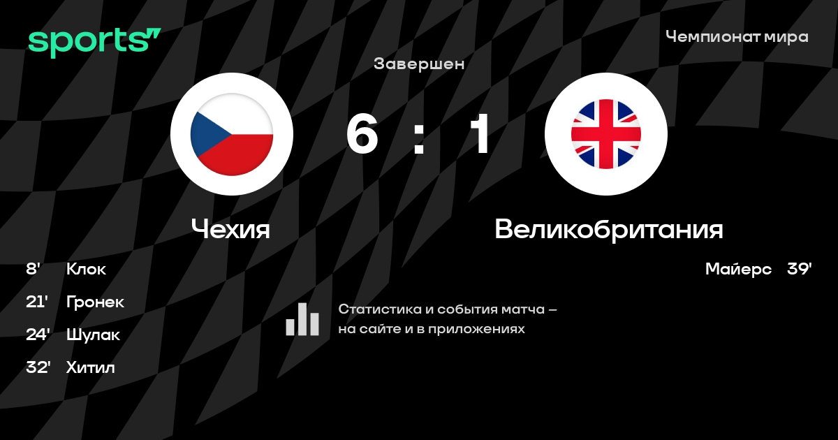 В прошедшем матче в рамках турнира Чемпионат мира (Группа A) состоялась встреча команд Чехия - Великобритания в городе Рига (Латвия) на стадионе Олимпийский спортивный центр (вместимость - 2500)