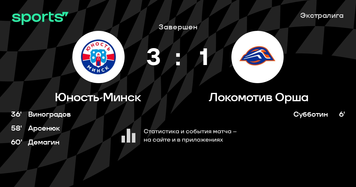 В прошедшем матче в рамках турнира Экстралига состоялась встреча команд Юность-Минск - Локомотив Орша в городе Минск (Беларусь) на стадионе Чижовка-Арена (вместимость - 9487)