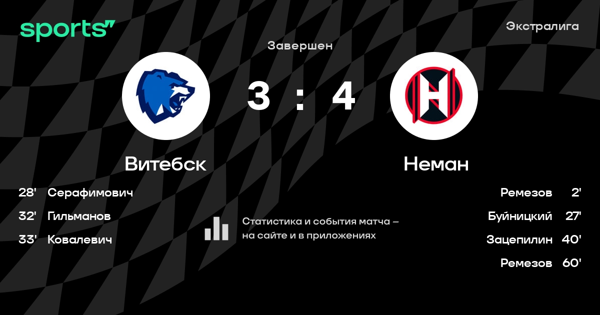 В прошедшем матче в рамках турнира Экстралига состоялась встреча команд Витебск - Неман в городе Витебск (Беларусь) на стадионе Витебский дворец спорта (вместимость - 2000)