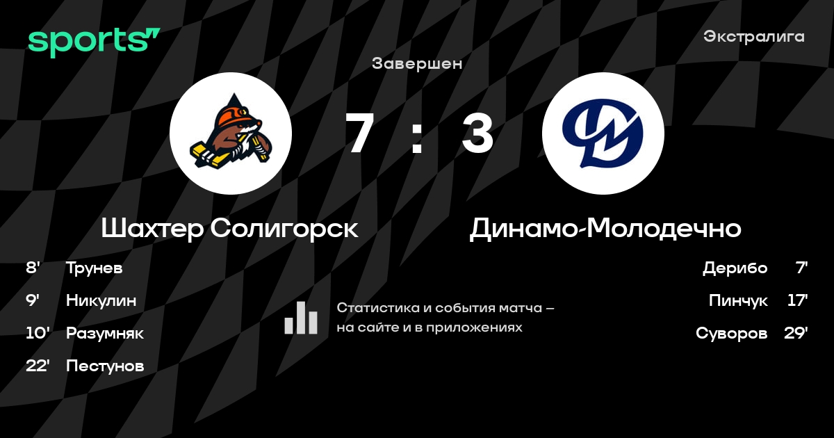 В прошедшем матче в рамках турнира Экстралига состоялась встреча команд Шахтер Солигорск - Динамо-Молодечно в городе Солигорск (Беларусь) на стадионе Ледовый дворец спорта Солигорск (вместимость - 1800)