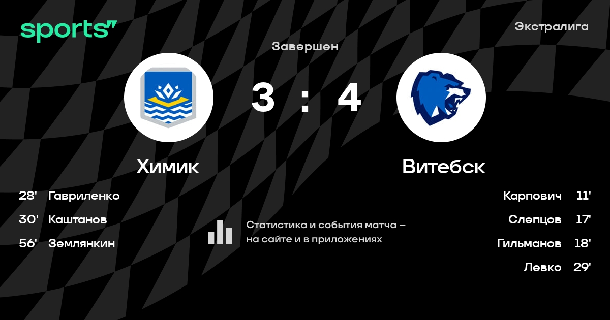 В прошедшем матче в рамках турнира Экстралига состоялась встреча команд Химик - Витебск в городе Новополоцк (Беларусь) на стадионе Дворец культуры и спорта (вместимость - 1200)