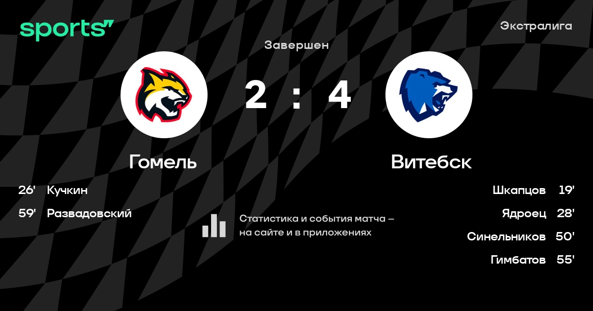 В прошедшем матче в рамках турнира Экстралига состоялась встреча команд Гомель - Витебск в городе Гомель (Беларусь) на стадионе Ледовый дворец Гомель (вместимость - 2700)