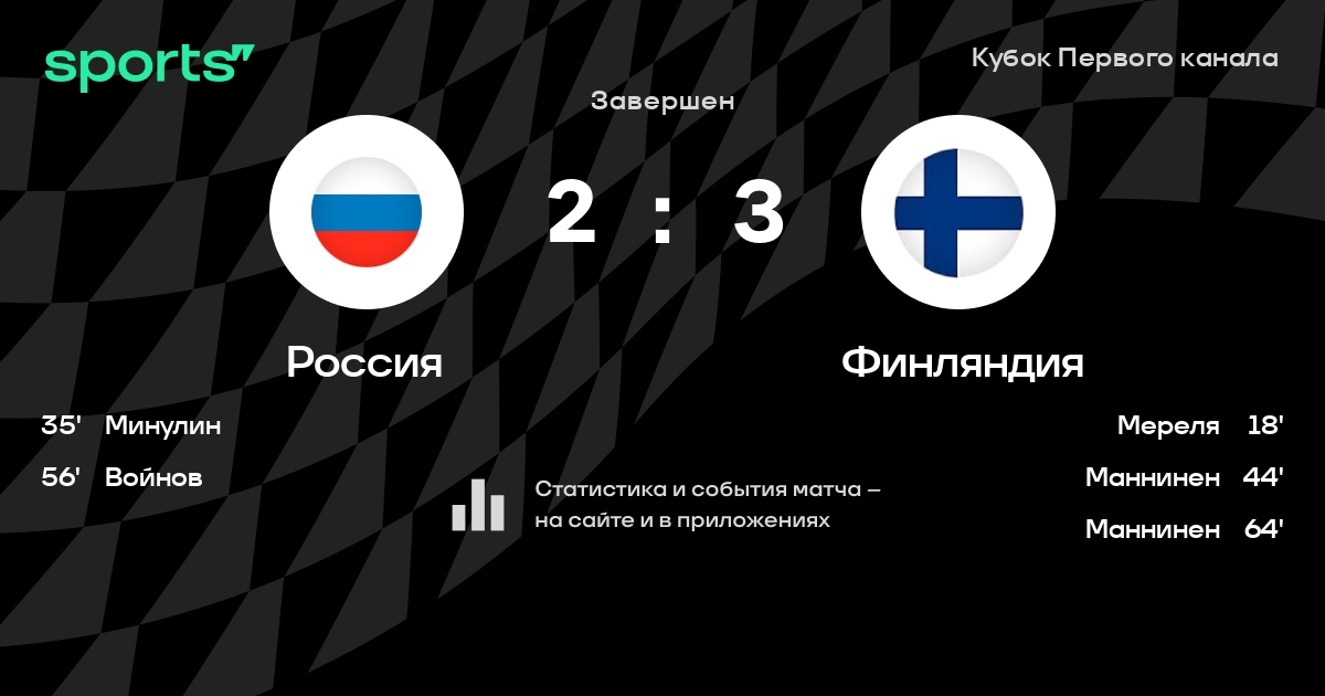 В прошедшем матче в рамках турнира Кубок Первого канала состоялась встреча команд Россия - Финляндия в городе Москва (Россия) на стадионе ЦСКА-Арена