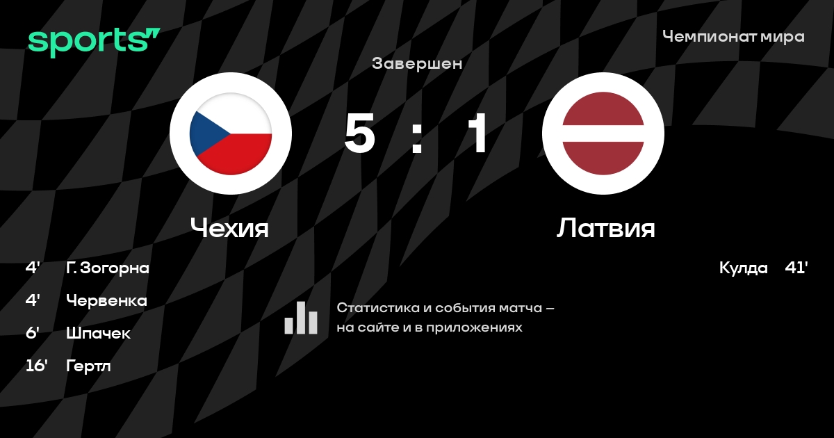 В прошедшем матче в рамках турнира Чемпионат мира (Группа B) состоялась встреча команд Чехия - Латвия в городе Тампере (Финляндия) на стадионе Нокиа Арена (вместимость - 13455)