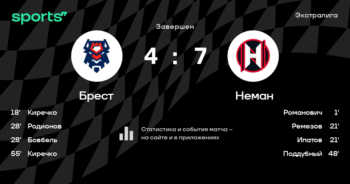 В прошедшем матче в рамках турнира Экстралига состоялась встреча команд Брест - Неман в городе Брест (Беларусь) на стадионе Ледовый дворец Брест (вместимость - 2000)