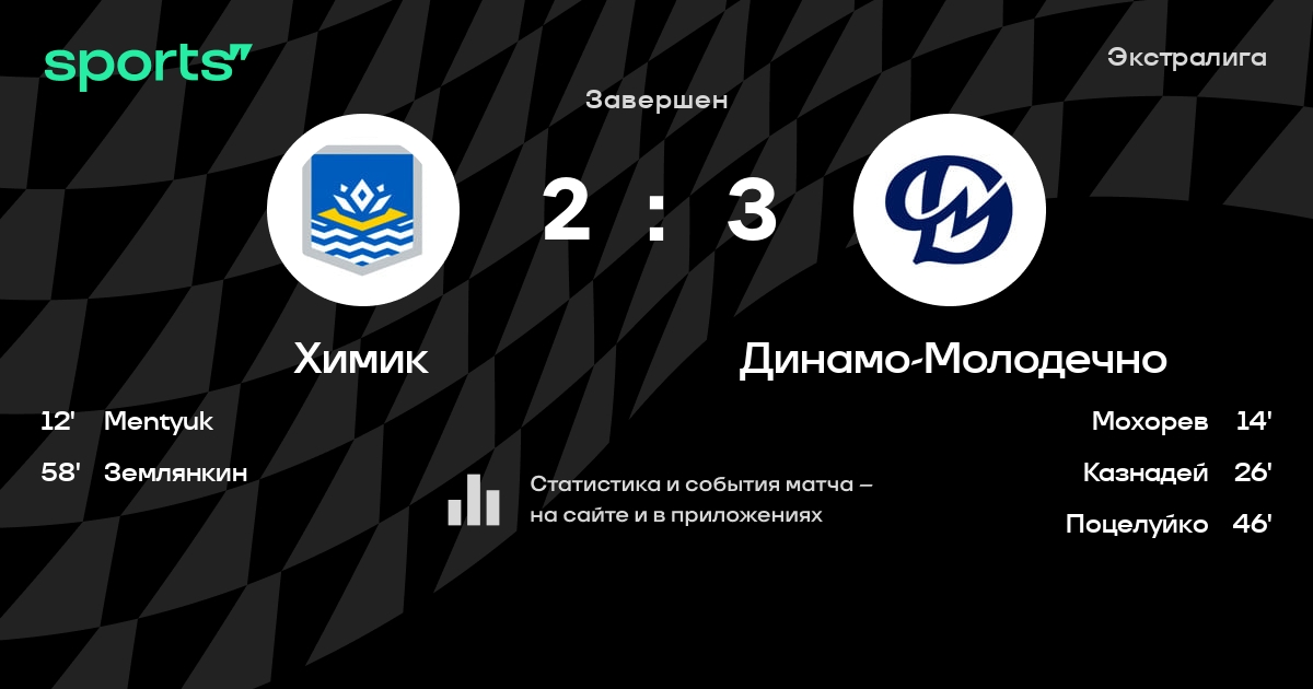 В прошедшем матче в рамках турнира Экстралига состоялась встреча команд Химик - Динамо-Молодечно в городе Новополоцк (Беларусь) на стадионе Дворец культуры и спорта (вместимость - 1200)
