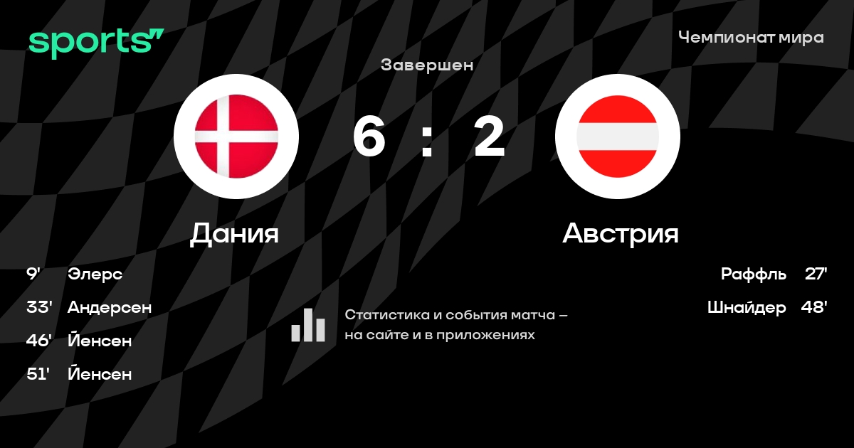 В прошедшем матче в рамках турнира Чемпионат мира (Группа A) состоялась встреча команд Дания - Австрия в городе Тампере (Финляндия) на стадионе Нокиа Арена (вместимость - 13455)