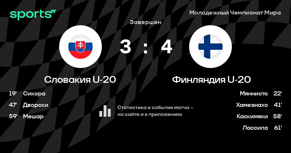 В прошедшем матче в рамках турнира Молодежный Чемпионат Мира (Четвертьфинал) состоялась встреча команд Словакия U-20 - Финляндия U-20 в городе Гетеборг (Швеция) на стадионе Фрелундаборг (вместимость - 7600)